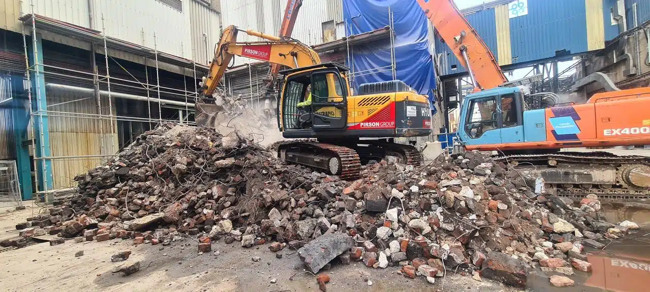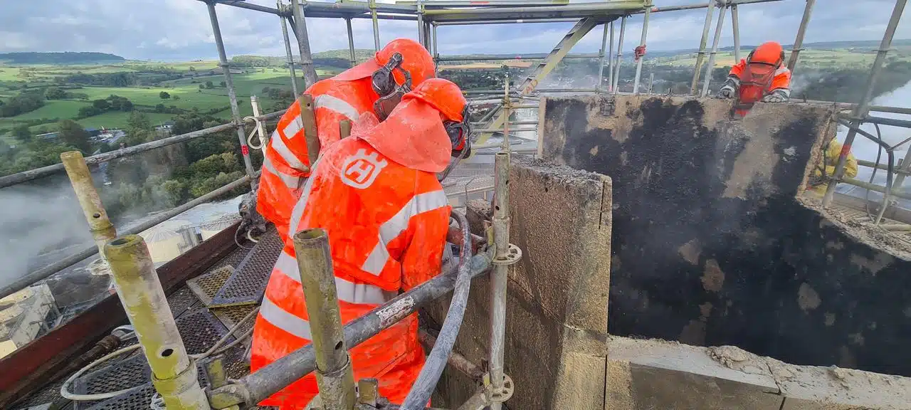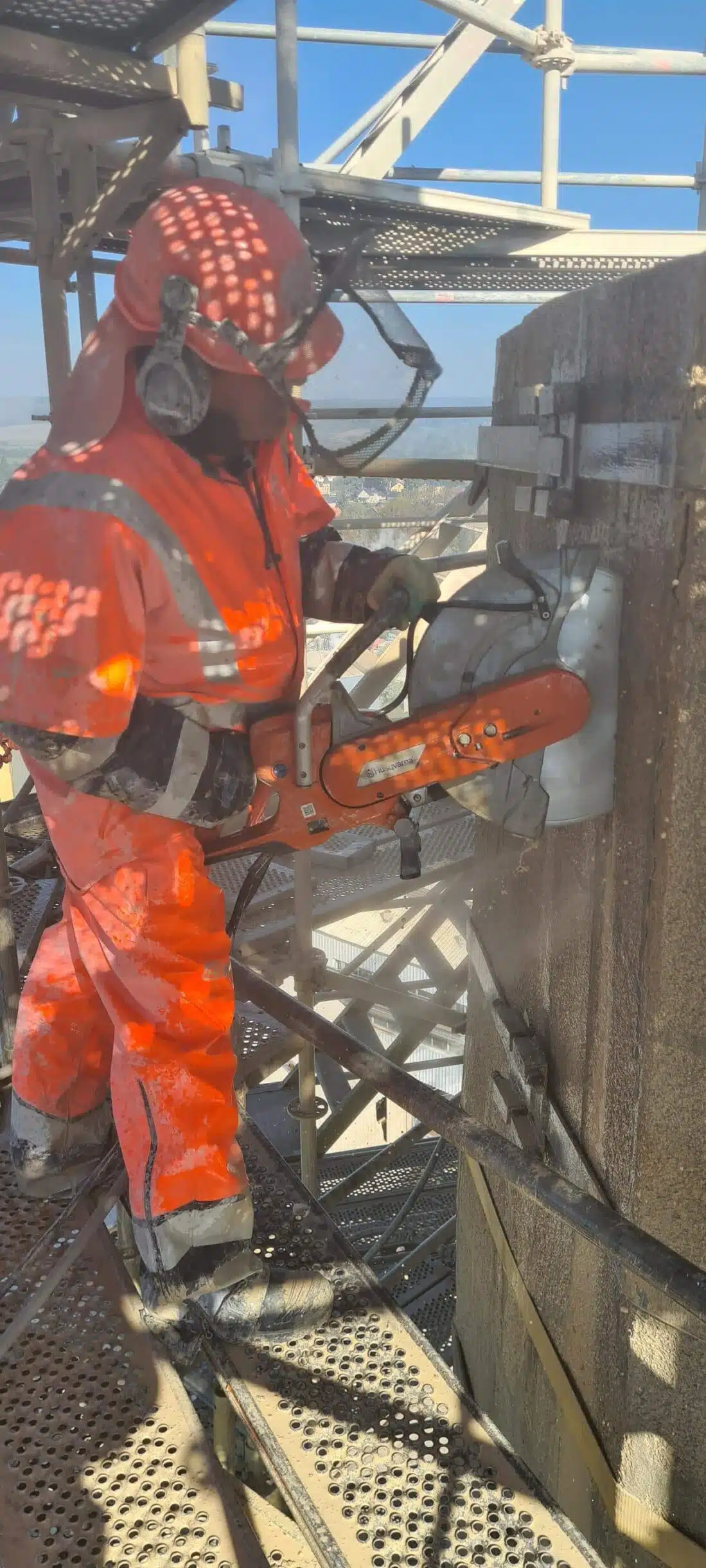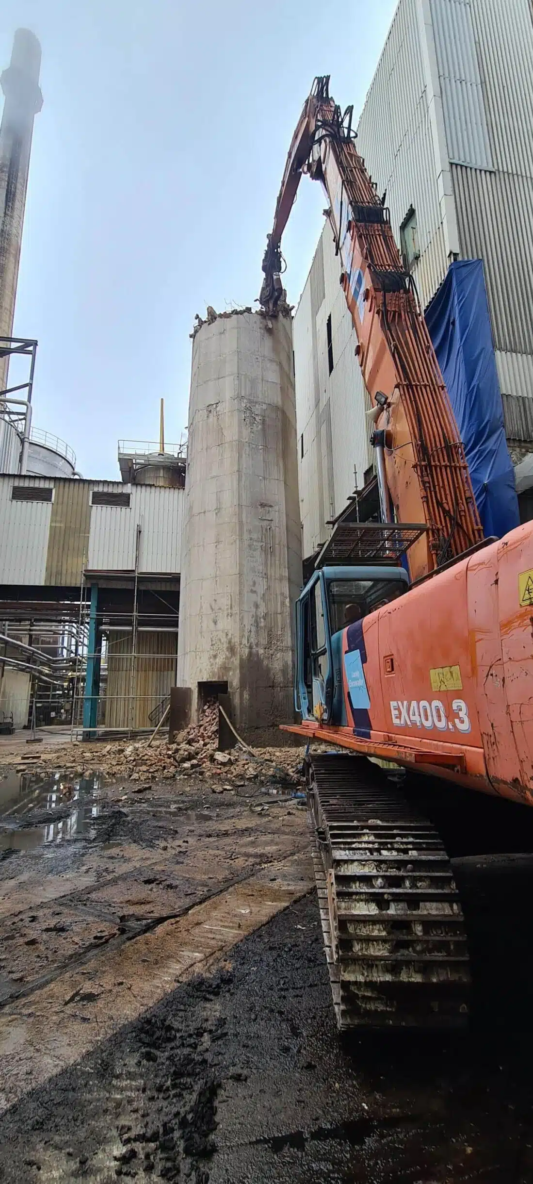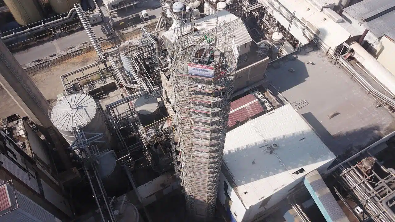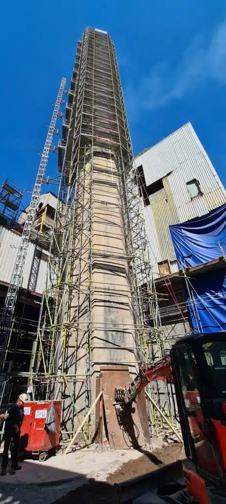 Déconstruction d’une cheminée béton 62m de hauteur en plein cœur d’une usine en production.